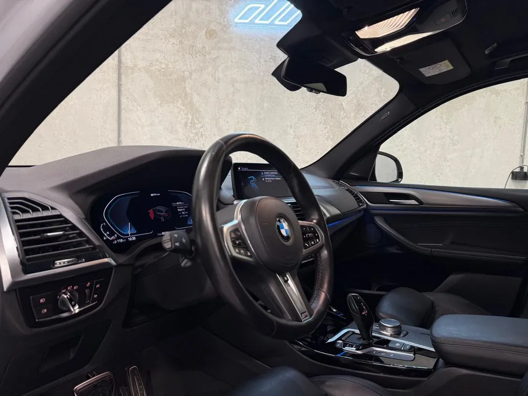 Deze BMW X3 is rechtstreeks afkomstig van een officiële BMW-dealer in Duitsland. De auto is door ons persoonlijk geselecteerd en geïmporteerd, volledig schadevrij en alle bijbehorende documentatie is aanwezig. Daarmee bent u verzekerd van een transparante en betrouwbare herkomst. De BMW is rijk uitgerust en uitgevoerd in het prachtige Glacier-silber metallic wat het M-Sport pakket shadow-line uitstekend benadrukt. Nagenoeg alle opties zijn aanwezig op deze BMW. – Stuur- en stoelverwarming